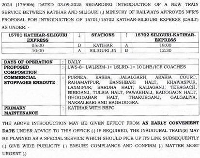 15701 एक्सप्रेस प्रतिदिन प्रातः 5:00 बजे कटिहार से खुलेंगी और सुबह 10:00 बजे सिलीगुड़ी पहुँचेंगी। वापसी में 15702 एक्सप्रेस प्रतिदिन दोपहर 12:30 को सिलीगुड़ी से खुलेगी और शाम 18:00 बजे कटिहार पहुँचेंगी।
