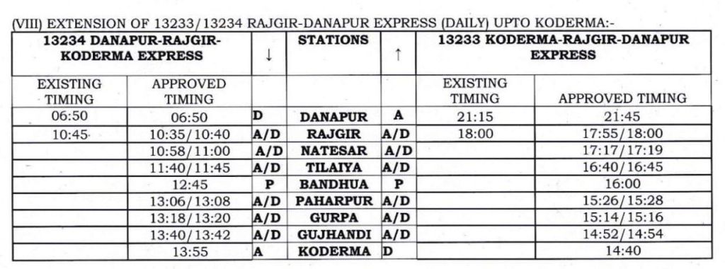 5 : 13233/34 राजगीर दानापुर राजगीर प्रतिदिन राजगृह एक्सप्रेस का राजगीर से आगे कोडरमा तक विस्तार।
