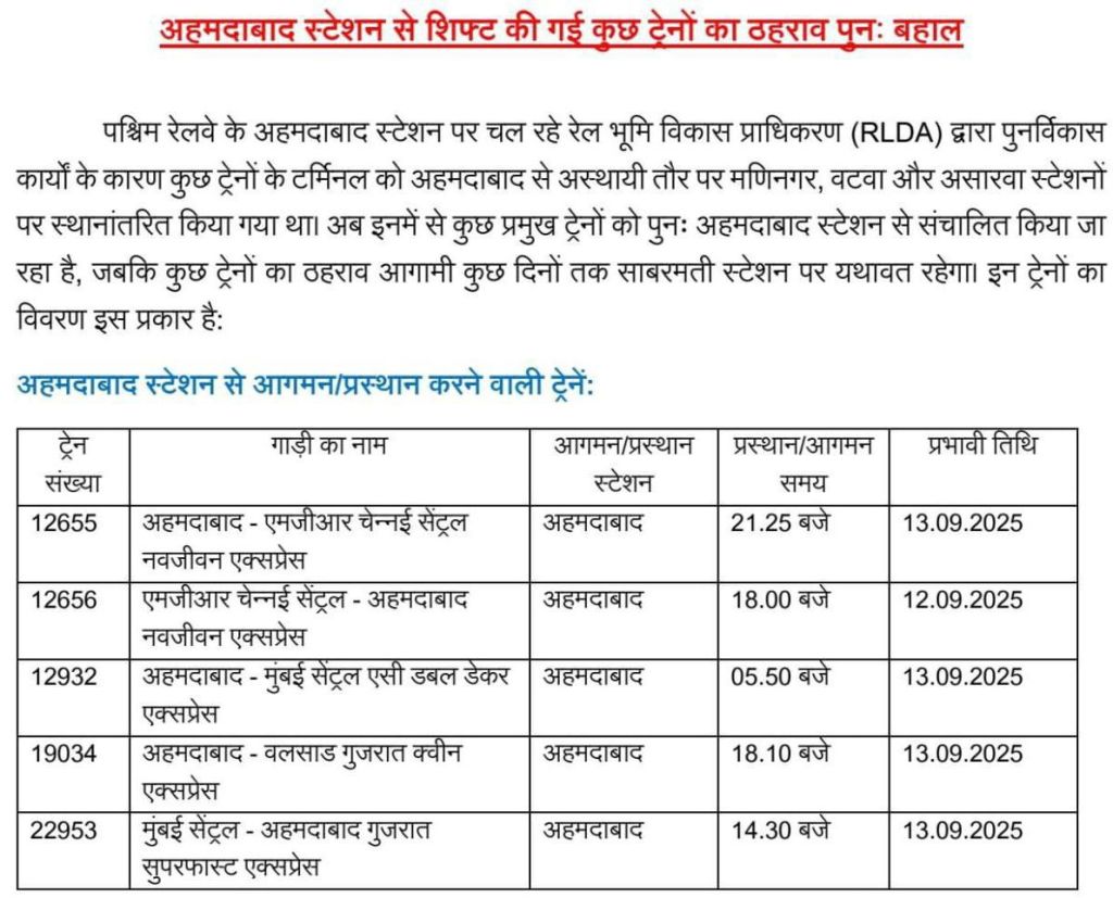 पश्चिम रेल के अहमदाबाद, सूरत स्टेशनोंपर स्टेशन पुनर्विकास कार्योंके चलते कुछ नियमित मेल/एक्सप्रेस एवं सुपरफास्ट गाड़ियोंके स्टोपेजेस को अहमदाबाद की जगह असरवा, वटवा एवं साबरमती पर स्थानांतरित किया गया था। इनमें से पाँच गाड़ियोंके अहमदाबाद टर्मिनल स्टेशन को दिनांक 13 सितम्बर से पुनर्स्थापित किए जा रहे है।