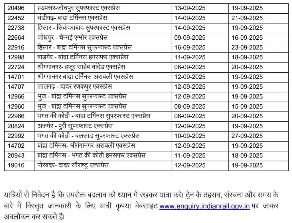 12931 मुम्बई सेंट्रल अहमदाबाद गुजरात एक्सप्रेस जो अहमदाबाद की जगह वटवा स्टेशन पर समाप्त की जा रही थी, दिनांक 13 से 19 सितम्बर तक मणिनगर स्टेशन पर समाप्त की जाएगी।