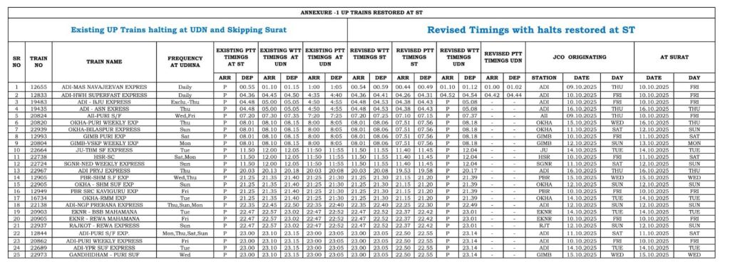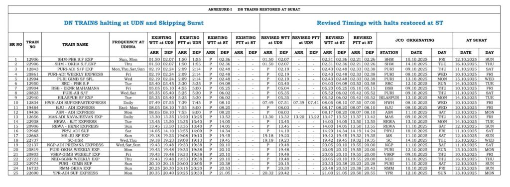 सूरत स्टेशन के स्टोपेजेस जिन्हें उधना स्टेशन पर स्थानांतरित किया गया था, उन्हें दिनांक 10 अक्टूबर 2025 से पुनर्स्थापित किया जा रहा है।
