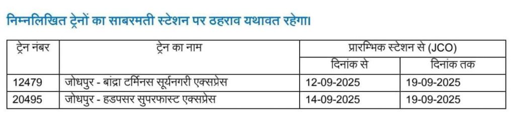 अभी भी निम्नलिखित 19 यात्री गाड़ियोंके अहमदाबाद स्टोपेज निम्नप्रकार से अहमदाबाद की जगह साबरमती स्टेशन पर जारी रहेंगे।