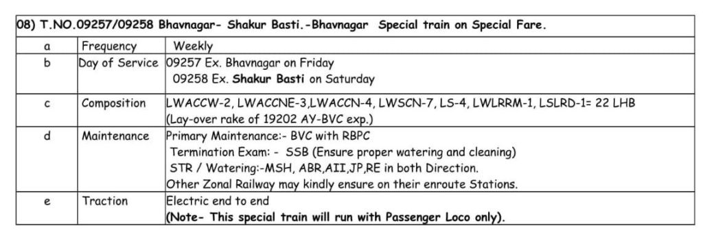 08 : 09257/58 भावनगर शकूर बस्ती भावनगर साप्ताहिक विशेष (11-11 फेरे) वाया बोटाद, सुरेंद्रनगर, वीरमगाम, पालनपुर, अबु रोड, मारवाड़ जंक्शन, अजमेर, जयपुर, बांदीकुई, अलवर, रेवाड़ी, दिल्ली कैंट