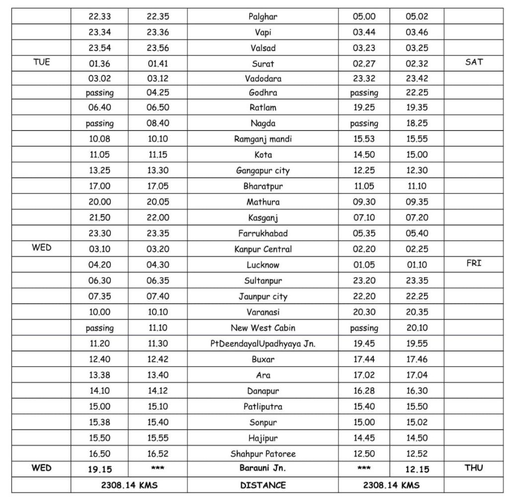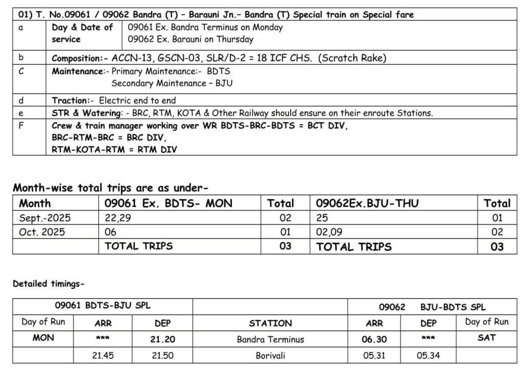 1 : 09061/62 बान्द्रा टर्मिनस बरौनी बान्द्रा टर्मिनस साप्ताहिक विशेष (3-3 फेरे) वाया वडोदरा, रतलाम, कोटा, भरतपुर, मथुरा, कासगंज, कानपुर, लखनऊ, वाराणसी, पण्डित दीनदयाल उपाध्याय जंक्शन, दानापुर, पाटलिपुत्र, हाजीपुर
