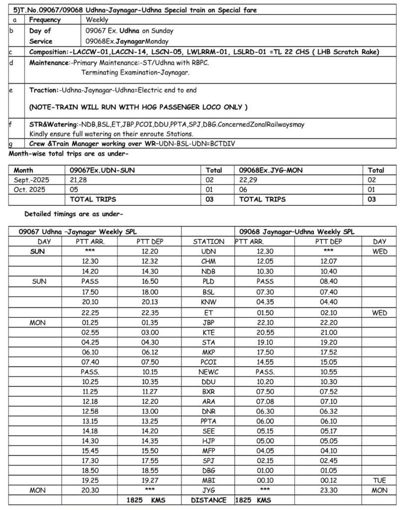 05 : 09067/68 उधना जयनगर उधना साप्ताहिक विशेष (3-3 फेरे) वाया नंदुरबार, भुसावल, इटारसी, जबलपुर, कटनी, प्रयागराज छिंवकी, पण्डित दीनदयाल उपाध्याय जंक्शन, दानापुर, पाटलिपुत्र, हाजीपुर, मुजफ्फरपुर, समस्तीपुर, दरभंगा