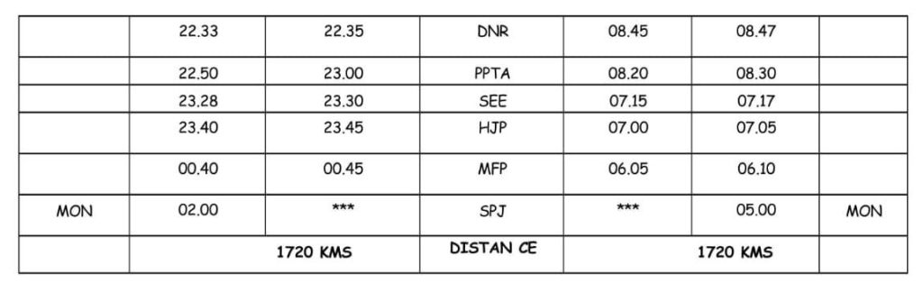 कोच संरचना : 07 वातानुकूलित थ्री टियर, 07 वातानुकूलित थ्री टियर इकोनॉमी, 01 जनरेटर कार, 01 एसएलआर कुल 16 LHB कोच