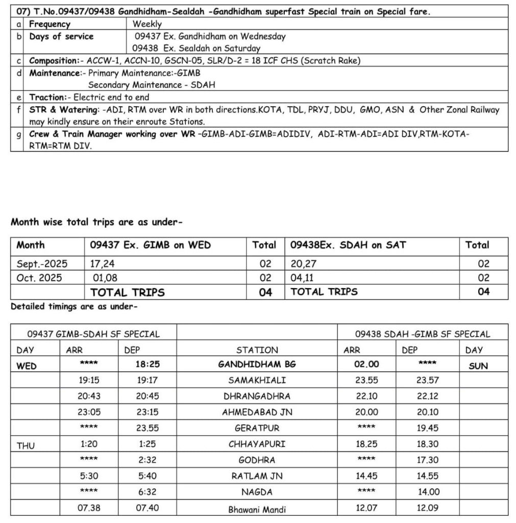 09437 : गांधीधाम से बुधवार 17, 24 सितम्बर, 01 एवं 08 अक्टूबर
