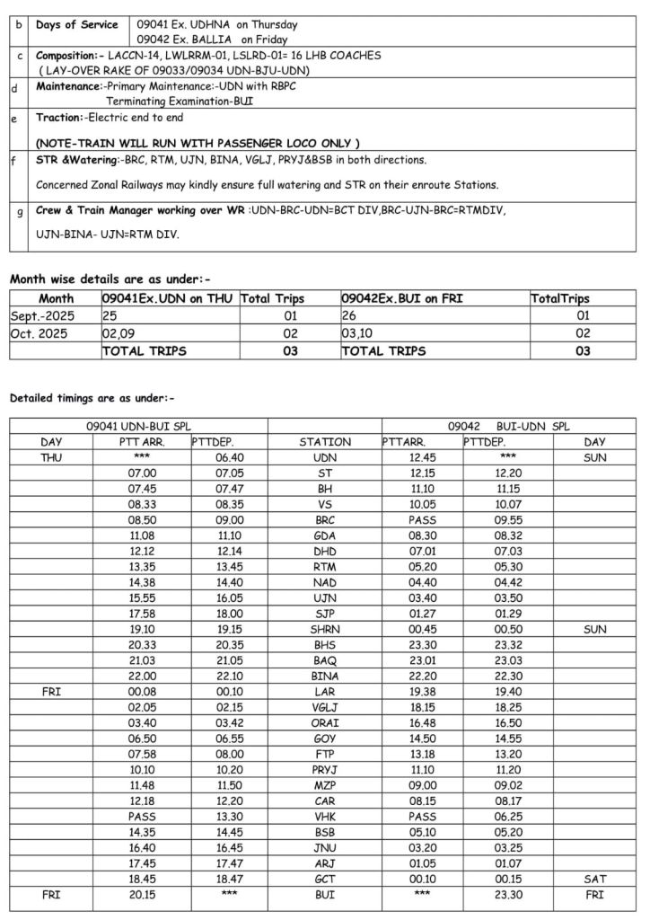 04 : 09041/42 उधना बलिया उधना वातानुकूलित साप्ताहिक विशेष (3-3 फेरे) वाया सूरत, वडोदरा, रतलाम, उज्जैन, सन्त हिरदाराम नगर, बीना, झाँसी, गोविन्दपुरी, प्रयागराज जंक्शन, वाराणसी, जौनपुर, अनौरिहार, गाजीपुर सिटी