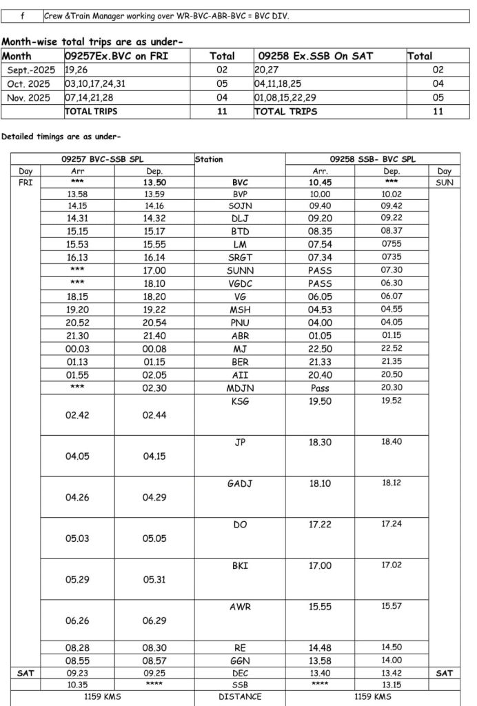 2 : 09029/30 बान्द्रा टर्मिनस रीवा बान्द्रा टर्मिनस साप्ताहिक अनारक्षित विशेष (6-6 फेरे) वाया भेस्तान, नंदुरबार, भुसावल, इटारसी, सतना