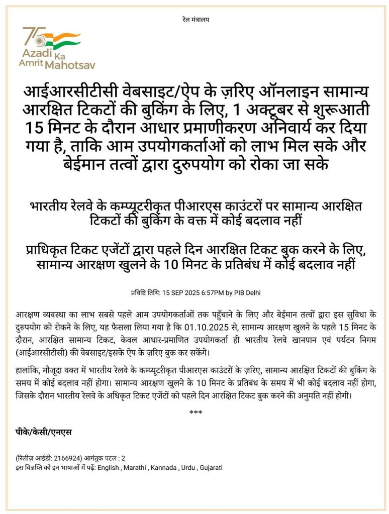 आरक्षण के सामान्य बुकिंग दिनांक 01 अक्टूबर 2025 से, रेलवे की ऑनलाइन आरक्षण टिकट प्रणाली, आईआरसीटीसी वेबसाइट, ऍप पर, पहले 15 मिनट तक केवल आधार प्रमाणित उपभोक्ता ही टिकट बुक करा पाएंगे। उदाहरण के तौर पर अग्रिम आरक्षण अवधि की टिकट, जो 60 दिन पहले खुलती है, उसमे सुबह 8:00 से 8:15 तक केवल आधार प्रमाणित पंजीकृत यूजर्स ही टिकट आरक्षण करा पाएंगे।