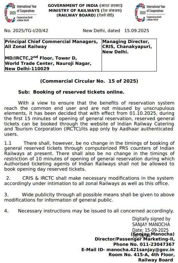 यह नियम सभी तरह के सामान्य आरक्षण बुकिंग पर लागू रहेगा।
