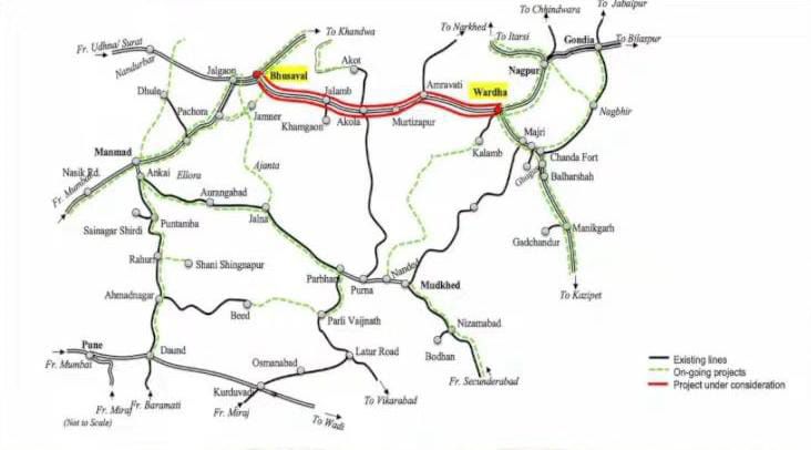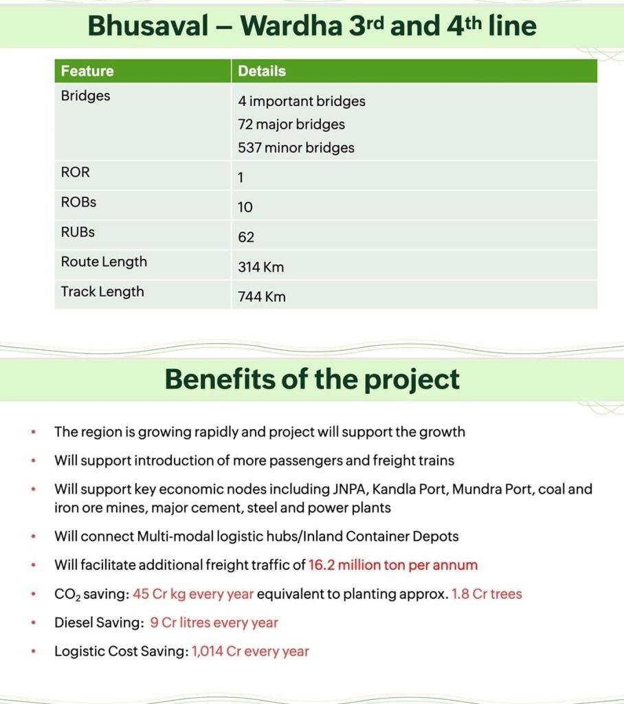 1: महाराष्ट्र में वर्धा – भुसावल के बीच 314 किलोमीटर लंबी तीसरी और चौथी लाइन