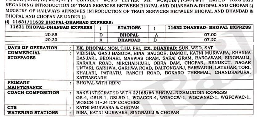 11631/32 भोपाल धनबाद भोपाल त्रिसाप्ताहिक एक्सप्रेस