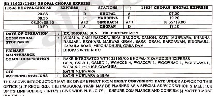 11633/34 भोपाल चोपन भोपाल साप्ताहिक एक्सप्रेस