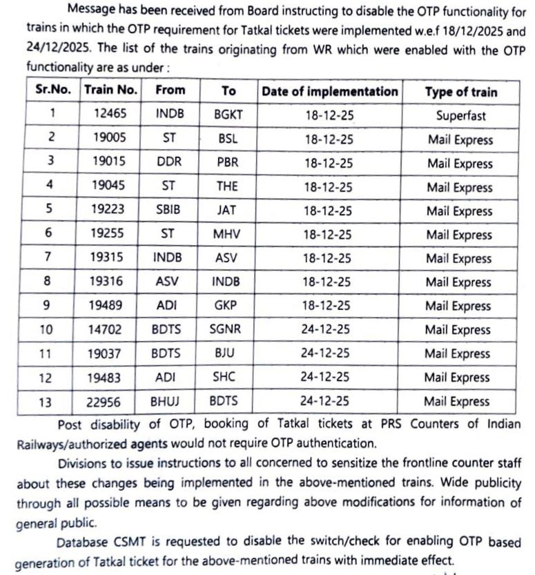 रेल प्रशासन ने तत्काल टिकटोंमे होने वाली धांधली को रोकने हेतु 18 एवं 24 दिसम्बर से कुछ गाड़ियोंमें ओटीपी अनिवार्य कर दिया था। चूँकि ओटीपी आने में लगने वाली देरी से PRS काउंटर्स एवं रेल टिकट एजेन्टों को आरक्षित टिकट मिलने में परेशानी होने लगी। यहाँतक की बुकिंग खुलते पहले मिनट में ही PRS काउंटर्स पर प्रतिक्षासूची की टिकट सामने आ जाती थी। इस परेशानी के चलते रेल प्रशासन ने निम्नलिखित तेरह गाड़ियोंके तत्काल बुकिंग को ओटीपी बेस्ड आरक्षण से हटाने का निर्णय लिया है। अर्थात उक्त गाड़ियोंकी तत्काल बुकिंग्ज के लिए ओटीपी की जरूरत नही होगी।