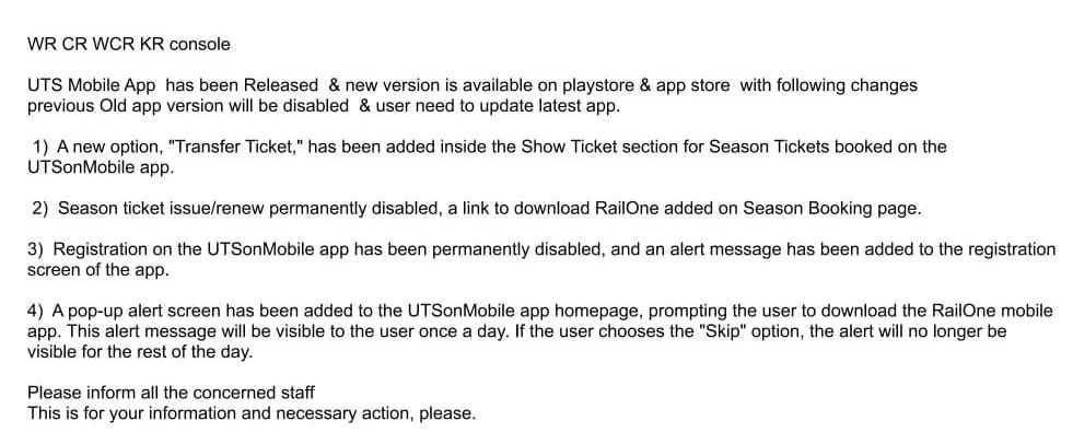 UTS ऍप खोलते ही उपभोक्ता को ‘रेल वन’ ऍप पर जाने की सलाह दी जाती है। यूँ समझिए की अब अनारक्षित टिकट, सीज़न पास, प्लेटफार्म टिकट इत्यादि कार्य ‘रेल वन’ ऍप के जरिए ही किए जाएंगे। हालाँकि पहले से पंजीकरण किए हुए उपभोक्ताओंको अभी भी UTS ऍप का उपयोग अपने अनारक्षित टिकट एवं प्लेटफार्म टिकट बनाने के लिए करते आएगा।