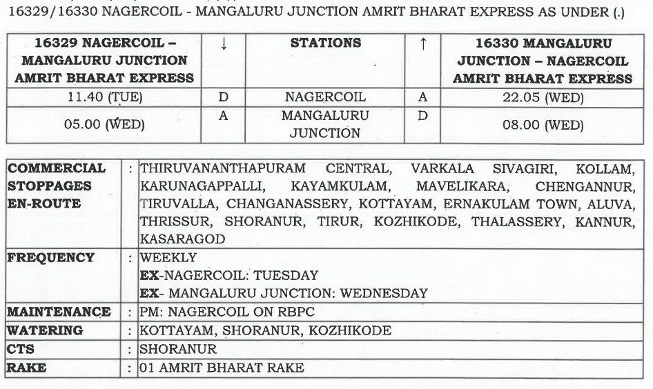 16329 अमृतभारत एक्सप्रेस प्रत्येक मंगलवार को 11:40 पर नागरकोइल से रवाना होकर अगले दिन प्रातः 5:00 बजे मंगालूरु जंक्शन पहुँचेंगी। वापसी में 16330 अमृतभारत एक्सप्रेस प्रत्येक बुधवार को सुबह 8:00 बजे मंगालूरु जंक्शन से रवाना होकर उसी दिन रात को 22:05 पर नागरकोइल पहुँचेंगी।
