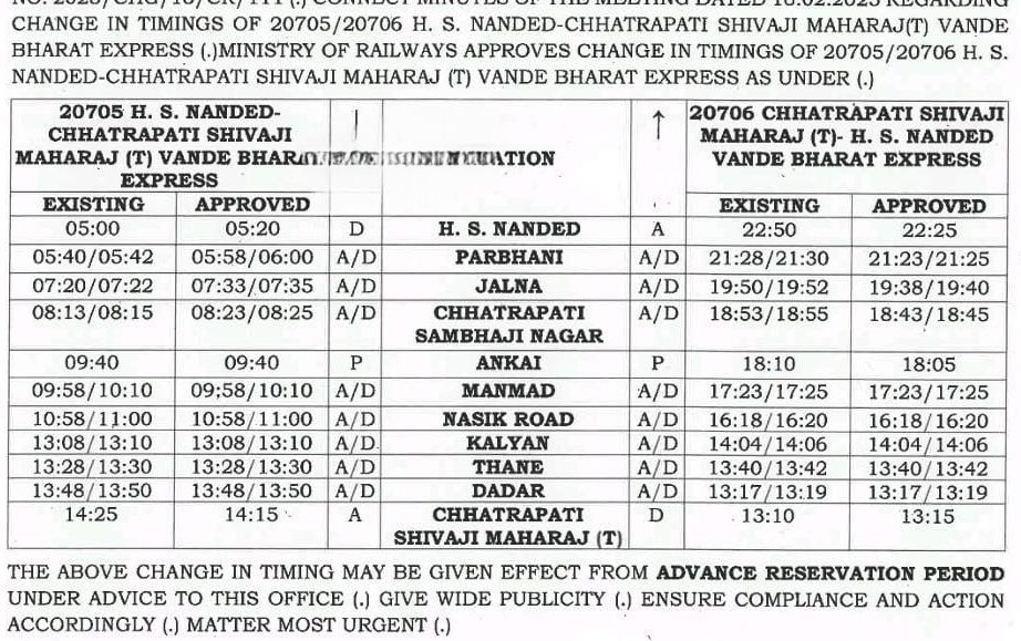 20705/06 हुजुरसाहिब नान्देड़ छत्रपति शिवाजी महाराज टर्मिनस हुजुरसाहिब नान्देड़ वन्देभारत एक्सप्रेस की समयसारणी में जल्द ही सकारात्मक बदलाव किया जाने वाला है।