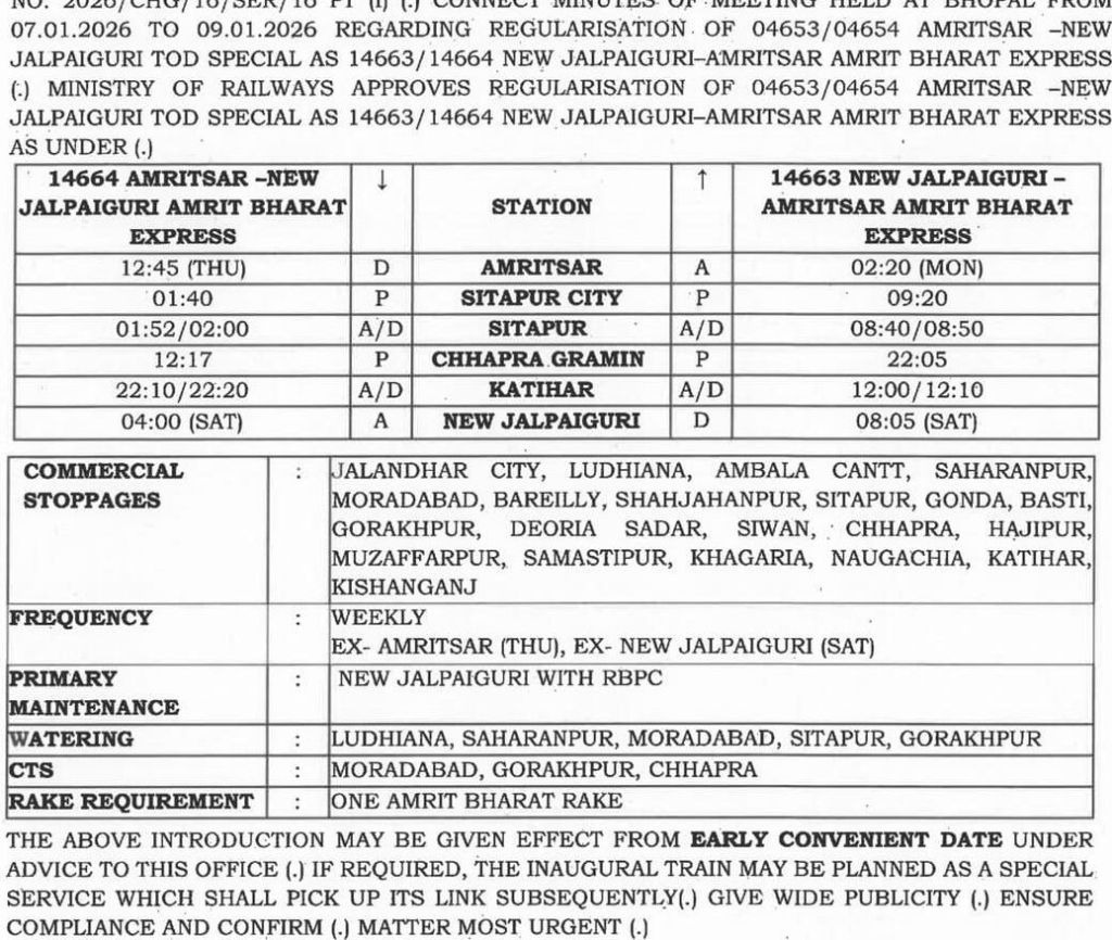 1: पूर्व विशेष गाड़ी 04653/54 अमृतसर न्यू जलपाईगुड़ी अमृतसर TOD एक्सप्रेस को 14663/64 न्यु जलपाईगुड़ी अमृतसर न्यु जलपाईगुड़ी अमृतभारत साप्ताहिक एक्सप्रेस में बदला जा रहा है।