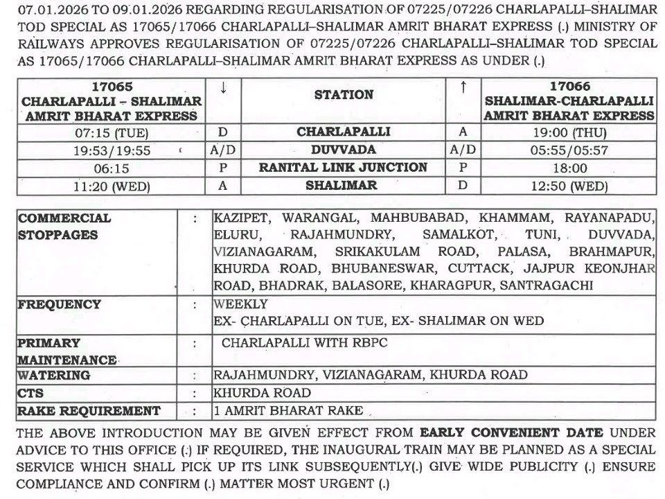 2 : पूर्व विशेष गाड़ी 07225/26 चारलापल्ली शालीमार चारलापल्ली TOD एक्सप्रेस को 17065/66 चारलापल्ली शालीमार चारलापल्ली अमृतभारत साप्ताहिक एक्सप्रेस में बदला जा रहा है।