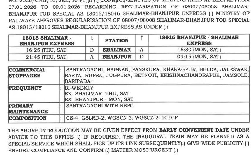 3 : पूर्व विशेष गाड़ी 08007/08 शालीमार भाँजपुर शालीमार TOD एक्सप्रेस को 18015/16 शालीमार भाँजपुर शालीमार द्विसाप्ताहिक एक्सप्रेस में बदला जा रहा है।