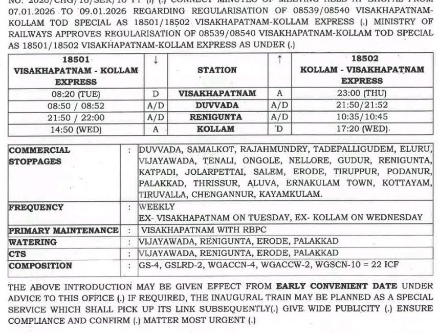 5: पूर्व विशेष गाड़ी 08539/40 विशाखापट्टनम कोलम विशाखापट्टनम TOD एक्सप्रेस को 18501/02 विशाखापट्टनम कोलम विशाखापट्टनम साप्ताहिक एक्सप्रेस में बदला जा रहा है।