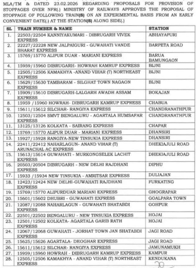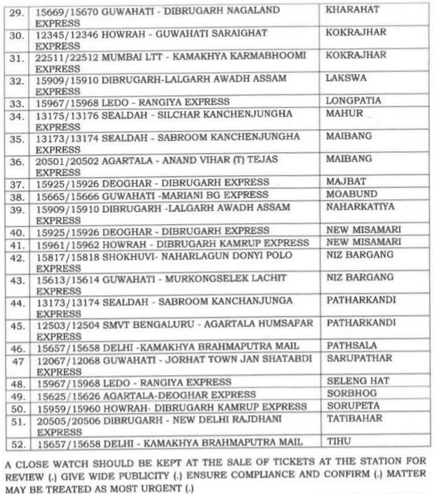 रेल प्रशासन ने निम्नलिखित परिपत्र जारी कर 52 जोड़ी यात्री गाड़ियोंको पूर्वोत्तर सीमान्त रेलवे NFR क्षेत्र में, असम राज्य के रेलवे स्टेशनोंपर स्टोपेजेस देने की सूचना प्रस्तुत की है। यह सभी स्टोपेजेस प्रायोगिक तौर पर दिए गए है और इन स्टेशनोंकी टिकट बिक्री पर निगरानी रखने की भी सूचना सम्बंधित रेल विभाग को दी जा रही है।