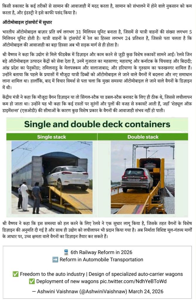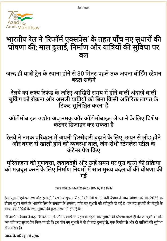 Uncategorisedभारतीय रेल की ‘रिफॉर्म एक्सप्रेस’ 24th Mar 202624th Mar 2026 Rail Duniya 24 मार्च 2026, मंगलवार, चैत्र, शुक्ल पक्ष, षष्टी, विक्रम संवत 2083 Share this: Share on WhatsApp (Opens in new window) WhatsApp Share on X (Opens in new window) X Share on Facebook (Opens in new window) Facebook Share on Telegram (Opens in new window) Telegram Email a link to a friend (Opens in new window) Email Like Loading... Related Published by Rail Duniya Rail Duniya is a magazine publishing all India train timings since 1988. View all posts by Rail Duniya