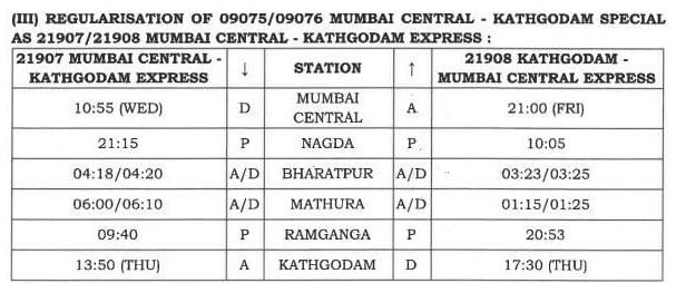 21907/08 (09075/76) मुम्बई सेंट्रल काठगोदाम मुम्बई सेंट्रल साप्ताहिक सुपरफास्ट वाया वडोदरा, रतलाम, कोटा, मथुरा, कासगंज, बरेली, लालकुआं