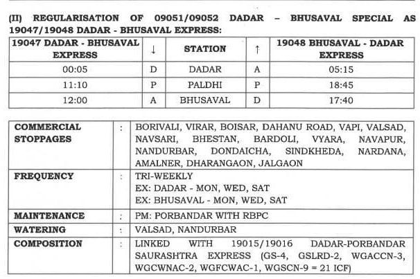 19047/48 (09051/52) दादर भुसावल दादर वाया वलसाड, भेस्तान, नंदुरबार, जलगाँव त्रिसाप्ताहिक एक्सप्रेस