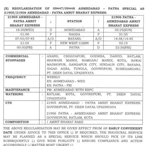 21905/06 (09447/48) अहमदाबाद पटना अहमदाबाद साप्ताहिक अमृतभारत एक्सप्रेस वाया आणंद गोधरा, रतलाम, कोटा, गंगापुर सिटी, आगरा, टूण्डला, गोविन्दपुरी, सूबेदारगंज, पण्डित दीनदयाल उपाध्याय जंक्शन