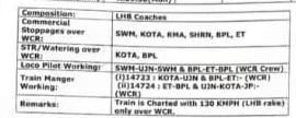 कोच संरचना : 02 वातानुकूल टू टियर, 03 वातानुकूल थ्री टियर, 07 स्लिपर एवं 02 द्वितीय साधारण, 01 जनरेटर कार, 01 एसएलआर कुल 16 LHB कोच