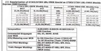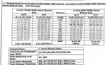 स्टोपेजेस : चूँकि विशेष गाड़ी 01449/50 फिलहाल साधारण ICF रैक से संचालित की जा रही है और नियमितीकरण में इसे अमृतभारत रैक मिलने जा रहा है अतः इसके स्टोपेजेस का भी पुनः निर्धारण हो सकता है। इस गाड़ी के स्टोपेजेस की प्रतीक्षा रहेगी।