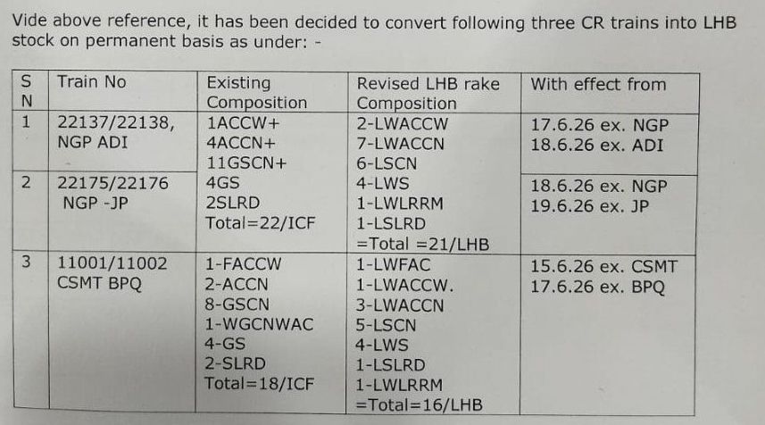 दिनांक 15 जून 2026 से मुम्बई से एवं 17 जून 2026 से बल्हारशाह से LHB रैक से संचालित होंगी। नई कोच संरचना में 01 वातानुकूल प्रथम, 01 वातानुकूल टू टियर, 03 वातानुकूल थ्री टियर, 05 स्लिपर, 04 द्वितीय साधारण, 01 जनरेटर कार, 01 एसएलआर कुल 16 LHB कोच