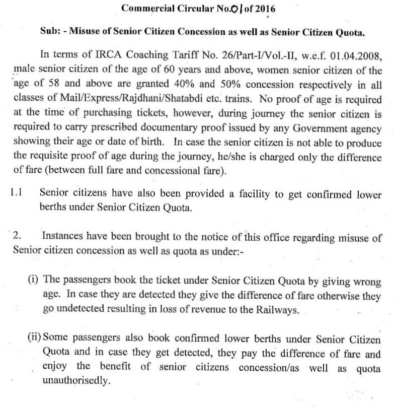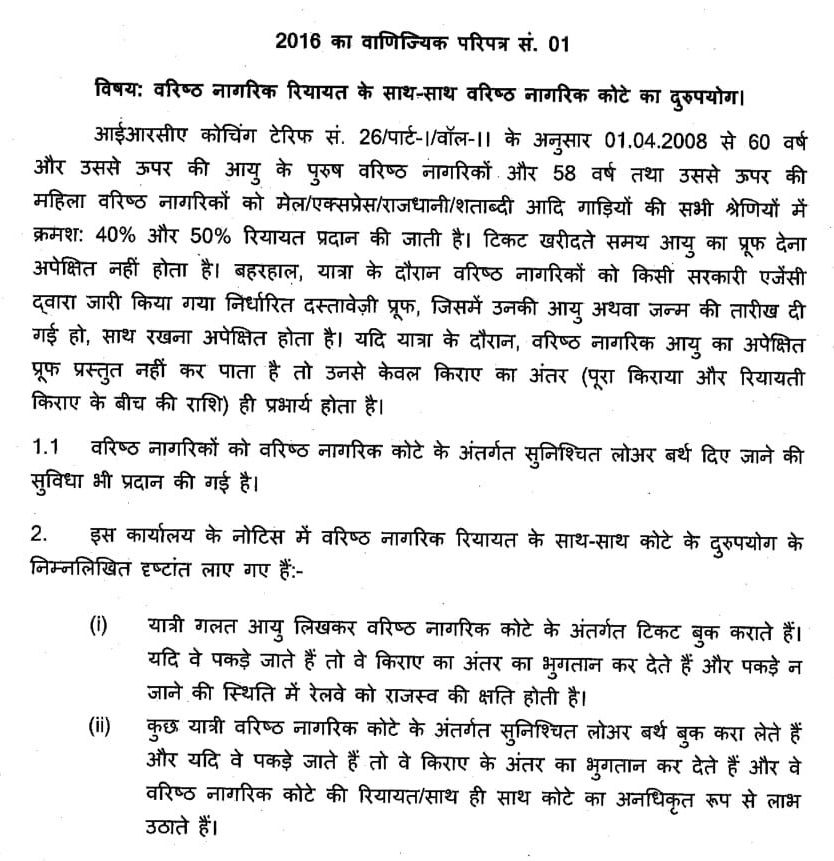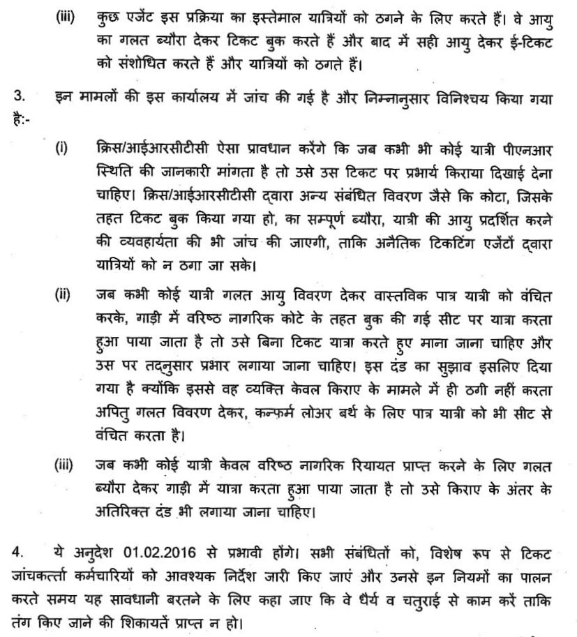यह परिपत्र, यदि यात्री गलत तरीके से रेल द्वारा निर्देशित कोटोंका फायदा लेकर टिकट बुक करता है और यात्रा के दौरान पकड़ा जाता है तो रेल प्रशासन उसके साथ किस तरह व्यवहार करेगी यह दर्शाया गया है।