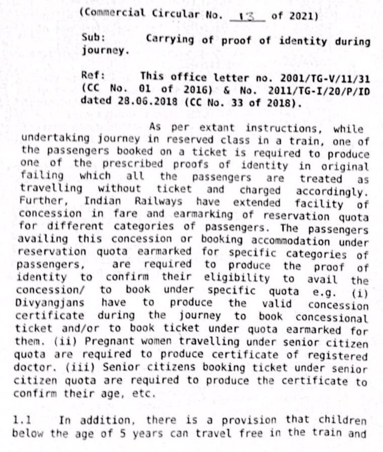 अब यह आरक्षित टिकटधारको ने, रेल यात्रा के दौरान टिकट जाँच दल द्वारा माँग किए जानेपर, अपने सभी बुक्ड यात्रिओंमें से किसी एक यात्री का ओरिजिनल ‘फोटो पहचानपत्र’ प्रस्तुत करना चाहिए। यदि टिकटधारक ऐसा नही कर पाते है तो उक्त टिकट पर बुक किए गए सभी यात्रिओंको बिनाटिकट यात्री माना जाएगा और आगे उक्तानुसार कार्रवाई की जाएगी।