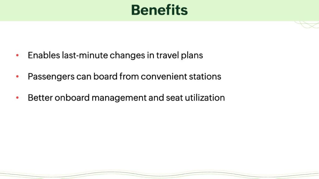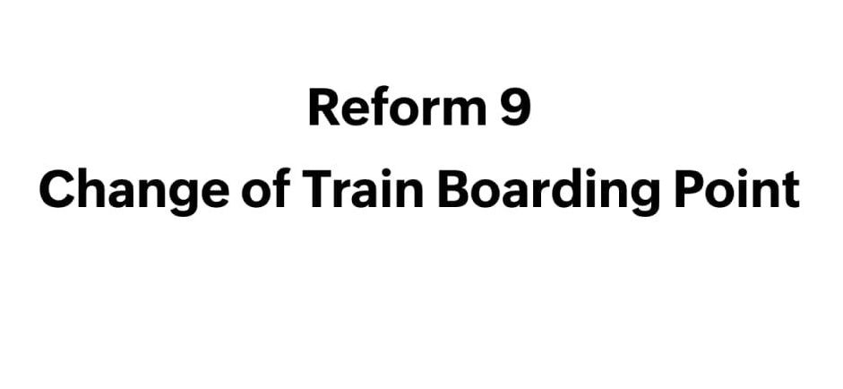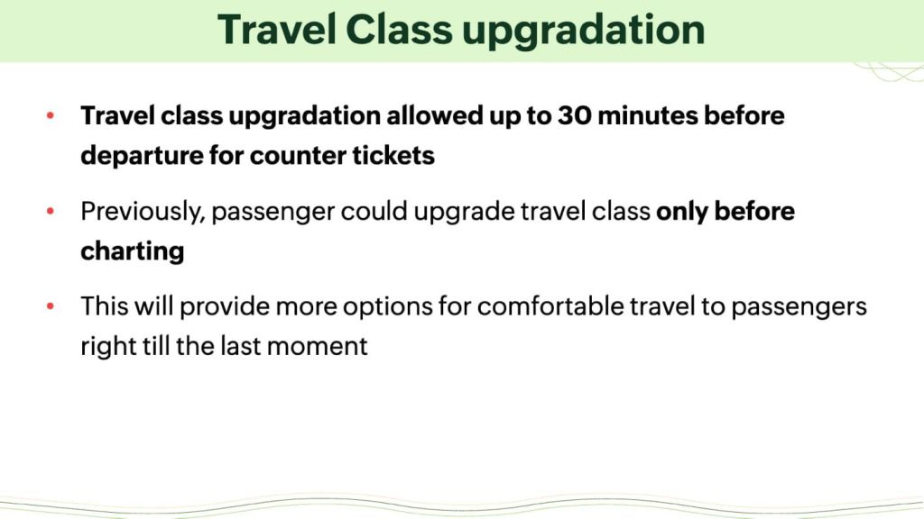 चार्टिंग में बदलाव : पुराने गाड़ी प्रस्थान समय से 4 घण्टे पहले की चार्टिंग समय को 9 से 18 घण्टे पहले तक बदला गया। इससे यात्री को अपनी रेल यात्रा सुनिश्चित करने में मद्त होने लगी।