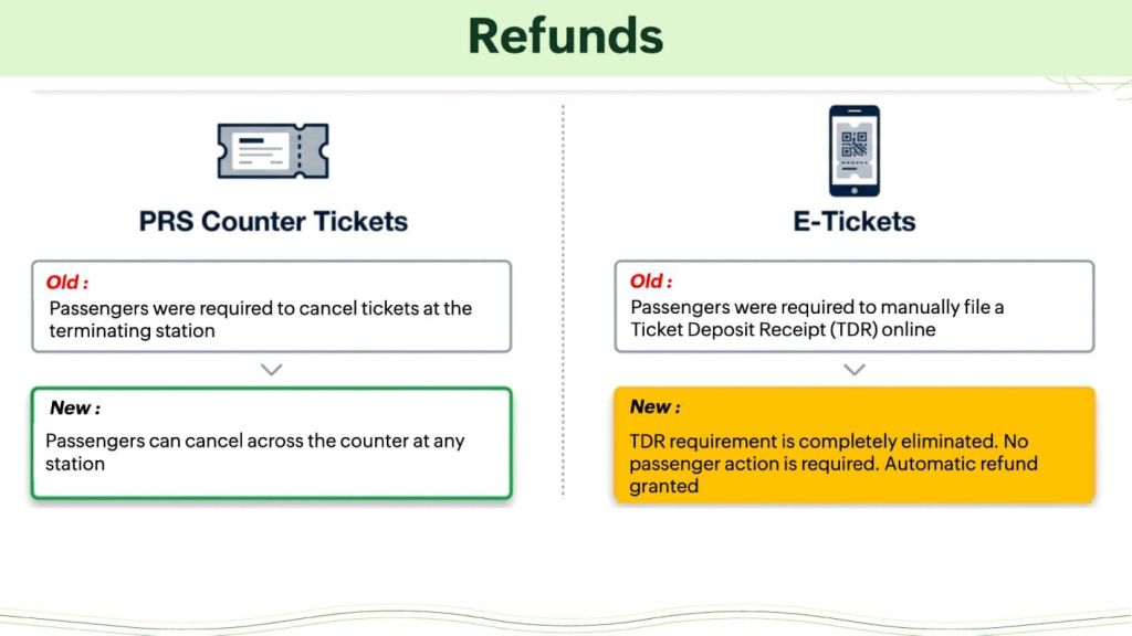 ई-टिकट धारकोंको अब TDR फॉर्म्स भरने की आवश्यकता नही रहेगी। टिकट रद्दीकरण के बाद रिफण्ड ऑटोमेटिक खातों में जमा होगा।