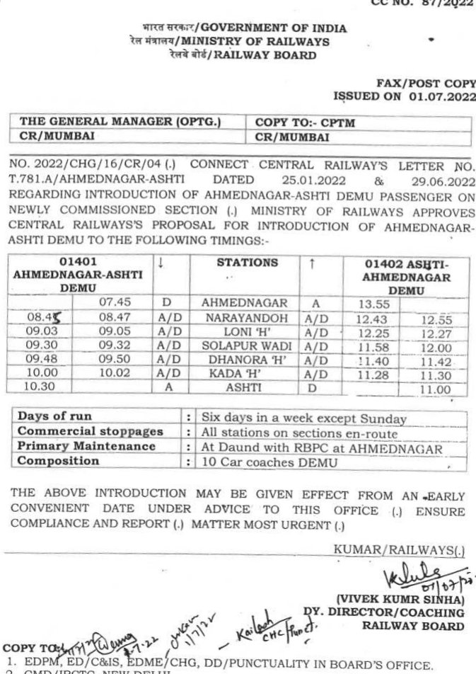 शेवटी एकदाची रेलवे बोर्डा कडून आष्टी गाडी सुरु करण्याला हिरवा कंदील मिळाला. आठवड्यात सहा दिवस, रविवार व्यतिरिक्त ही 10 डब्यांची डेमू गाड़ी सुरु करण्यास मध्य रेल्वेला सोयीचा दिवस निवडन्यास सांगण्यात आलेले आहे.