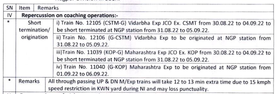 11039 कोल्हापूर गोंदिया महाराष्ट्र एक्सप्रेस जो दिनांक 30 अगस्त से 04 सितम्बर तक मुम्बई से रवाना होने वाली है, नागपूर तक ही चलाई जाएगी आगे नागपूर से गोंदिया के बीच रद्द रहेगी। उसी तरह 11040 गोंदिया कोल्हापूर महाराष्ट्र एक्स्प्रेस जो दिनांक 31 अगस्त से 05 सितम्बर तक गोंदिया के बजाय नागपूर से ही मुम्बई के लिए रवाना होगी।