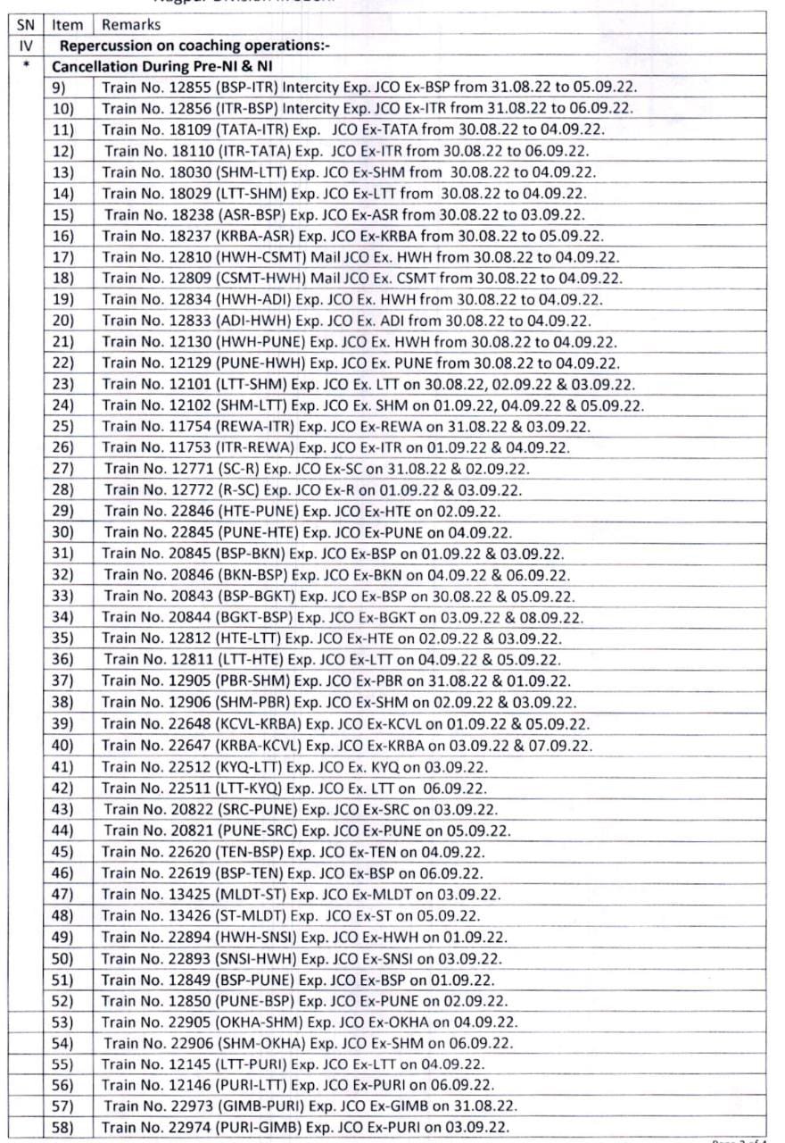 12849 बिलासपुर – पुणे एक्सप्रेस दिनांक 01 सितम्बर को और 12850 पुणे – बिलासपुर एक्सप्रेस दिनांक 02 सितम्बर तक अपने प्रारम्भिक स्टेशन से पूर्णतया रद्द हो कर, नहीं चलाई जाएगी।