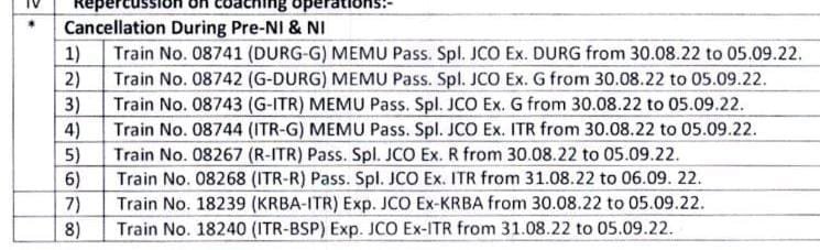 18239 गेवरा रोड – इतवारी एक्सप्रेस दिनांक 30 अगस्त से 05 सितम्बर तक और 18240 इतवारी – कोरबा एक्सप्रेस दिनांक 31 अगस्त से 06 सितम्बर तक अपने प्रारम्भिक स्टेशन से पूर्णतया रद्द हो कर, नहीं चलाई जाएगी।