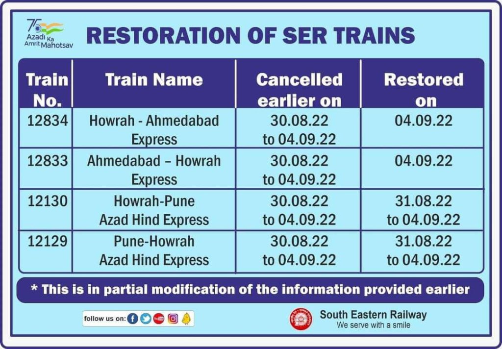 12129 पुणे हावड़ा आजाद हिंद एक्सप्रेस 31.08.2022 से 04.09.2022 तक रद्द की गई थी, अब निर्धारित कार्यक्रम के अनुसार प्रतिदिन चलेगी।