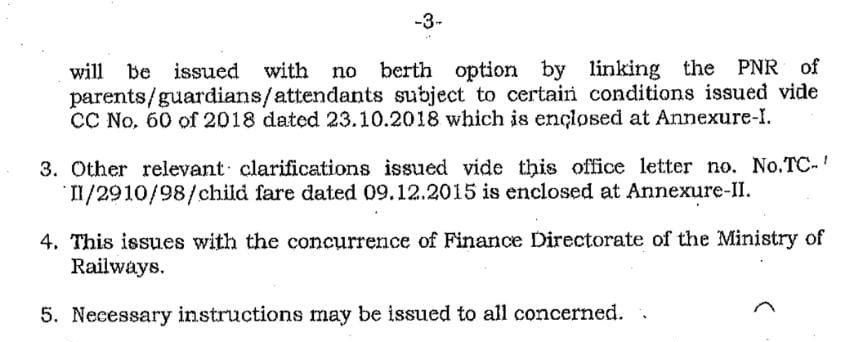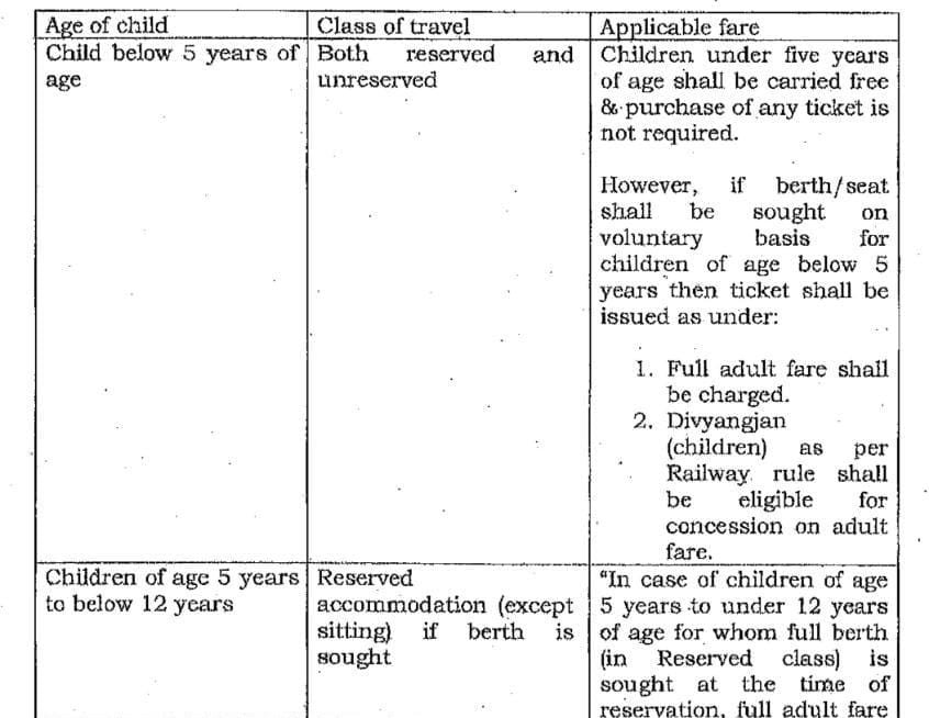 इसमे स्पष्ट किया है, यात्री यदि अपने किसी भी उम्र के बच्चे के लिए बर्थ का आबंटन चाहता है तो उसे पूरी बर्थ का शुल्क अदा करना होगा। वहीं बिना शयिका आरक्षण किया जाता है तो 0 से 5 वर्ष से कम तक आयु को मुफ्त, 5 वर्ष पूर्ण से 12 वर्ष से कम तक आधा किराया देय होगा।