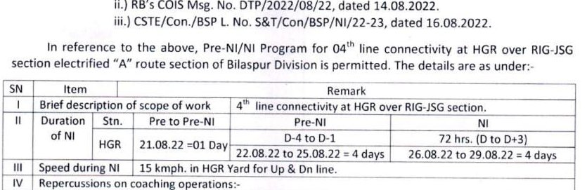 SECR दपुमरे के बिलासपुर मण्डल में चौथी रेल लाईन कनेक्टिविटी को लेकर तांत्रिक कार्य हेतु नागपुर – हावड़ा मार्ग की 62 गाड़ियाँ तकरीबन एक सप्ताह तक रद्द की जा रही है। निम्नलिखित सूची में, सभी गाड़ियोंकी JCO अर्थात अपने प्रारम्भिक स्टेशन से चलने की तिथिनुसार रद्दीकरण किया गया है। यात्रीगण को निवेदन है, निम्नलिखित तिथियोंमे नागपुर – बिलासपुर मार्ग पर रेल यात्रा का नियोजन रेलवे की हेल्पलाइन 139 या ऐप, वेबसाइट की मद्त लेकर करें।