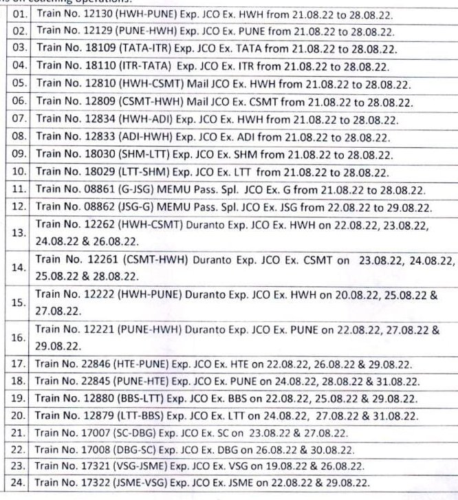 12870 हावड़ा मुम्बई छत्रपती शिवाजी महाराज टर्मिनस साप्ताहिक एक्सप्रेस हावड़ा से दिनांक 27 अगस्त को और 12869 मुम्बई छत्रपती शिवाजी महाराज टर्मिनस हावड़ा साप्ताहिक एक्सप्रेस अपने प्रारम्भिक स्टेशन मुम्बई से दिनांक 28 अगस्त को पूर्णतया रद्द होकर नहीं चलाई जाएगी।
