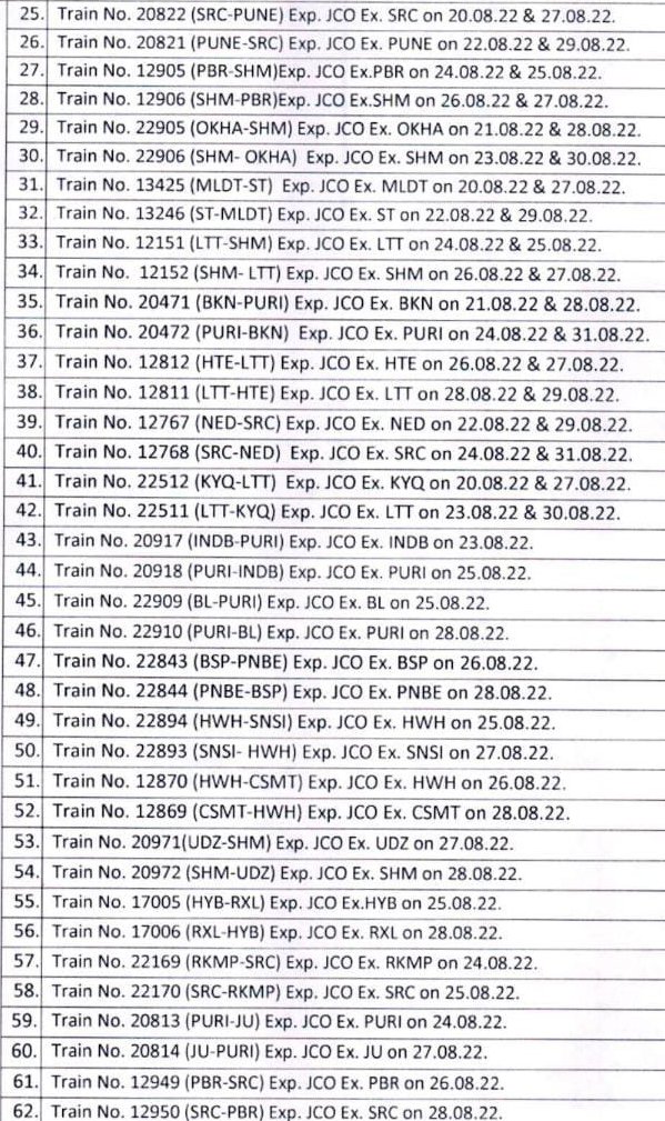 12151 लोकमान्य तिलक टर्मिनस शालीमार द्विसाप्ताहिक समरसता एक्सप्रेस दिनांक 24, एवं 25 अगस्त को लोकमान्य तिलक टर्मिनस से रवाना नहीं होगी, वापसीमे 12152 शालीमार लोकमान्य तिलक टर्मिनस द्विसाप्ताहिक समरसता एक्सप्रेस दिनांक 22, 25 एवं 29 अगस्त को शालीमार से नहीं चलेगी।