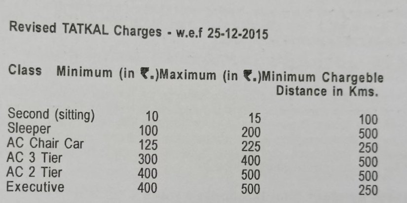 गौरतलब यह है, रेल विभाग की तत्काल योजना 1997 में तत्कालीन रेल मंत्री मा. नीतिश कुमार के कार्यकाल में लायी गयी। तत्काल किराया श्रेणी मे, सामान्य टिकिटोंके मूल किरायोंसे, द्वितीय श्रेणी मे 10% और बाकी सभी श्रेणियों मे 30% अतिरिक्त किराया जोड़ा जाता है। इसके अलावा दूरी की सीमा भी तय की गई है। तत्काल किराये किस तरह तय होते है इसके लिये निम्नलिखित चार्ट देखिए,