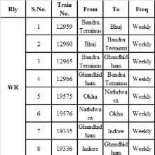 22830 शालीमार भुज साप्ताहिक एक्सप्रेस दिनांक 06 अगस्त से प्रत्येक शनिवार को और वापसीमे 22829 भुज शालीमार साप्ताहिक एक्सप्रेस 09 अगस्त से प्रत्येक मंगलवार को चलेगी।