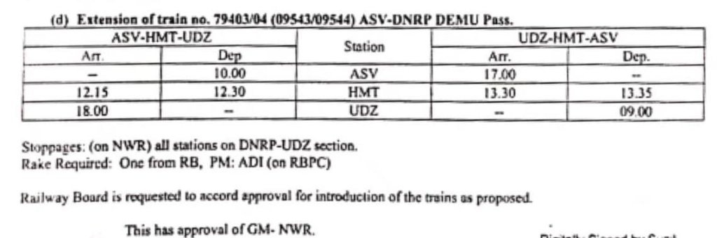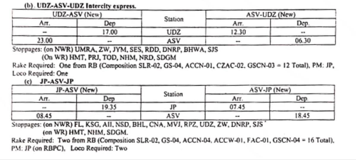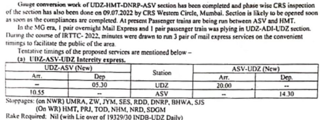 उदयपुर सिटी आसरवा उदयपुर सिटी प्रतिदिन गाड़ी, यह गाड़ी 19329/30 इन्दौर उदयपुर सिटी इन्दौर वीरभूमि एक्सप्रेस का विस्तार असरवा तक होगी। इस से इंदौर, उज्जैन, रतलाम क्षेत्र का अहमदाबाद से अलग मार्ग उदयपुर होते हुए जुड़ाव करेगी।